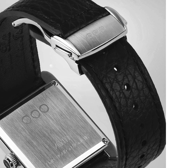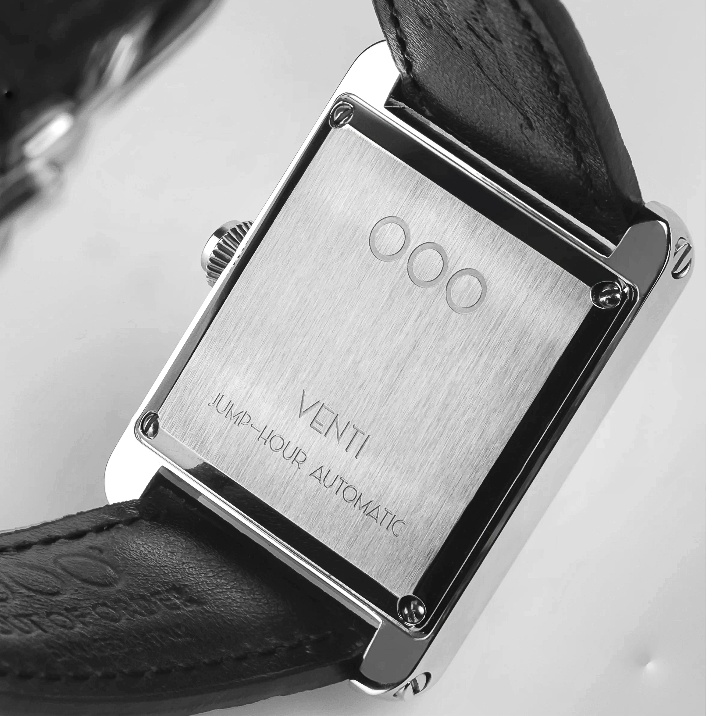 FORMA VENTI JUMPHOUR rectangular automatic watch black lacquered dial, jump-hour window, polished stainless-steel case, and black Italian leather strap.