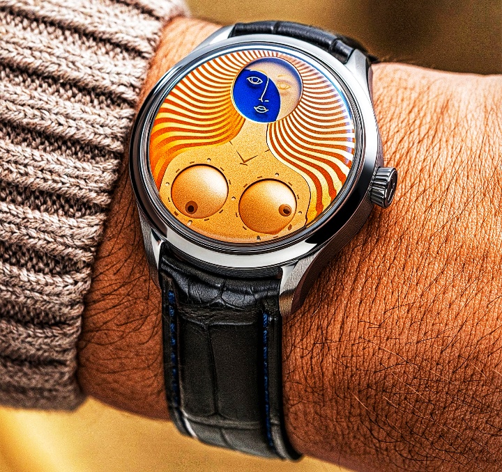 What truly sets this watch apart is its artistic indication of time. Instead of traditional hands, the hours and minutes are displayed using rotating disks, a signature approach often seen in Konstantin Chaykin’s creations.